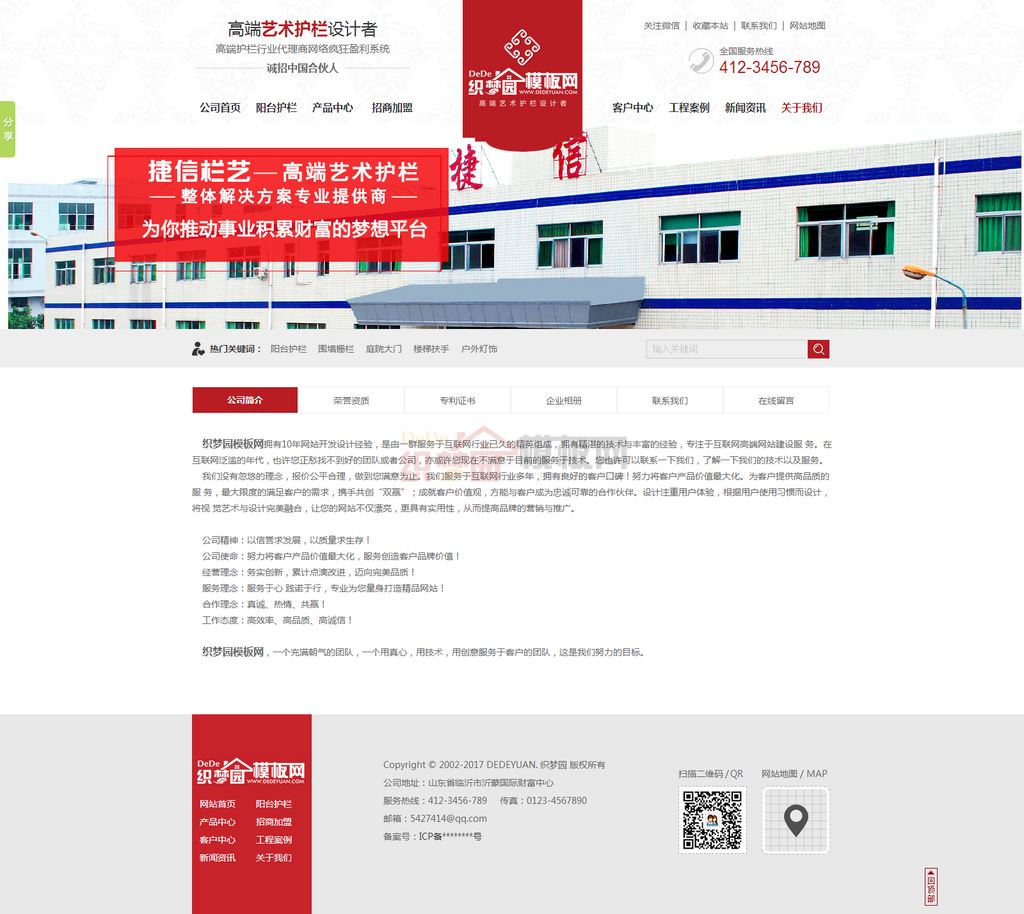 大型护栏围栏定制制作类企业织梦模板,本套模板由作者亲自仿制,与原网站90%以上相同,后台数据调用完整,修改方便,整站比较大型,产品采用图集功能,并且栏目带有二级菜单显示,内页设计多套列表页不同风格,添加留言、网站地图模板,整体大气时尚,有需要的朋友可以下载使用,本站可以用于多种行业用途,修改一下还是可以的;直接下载即可使用,升级到2017年最新织梦系统,本织梦模板整站完整打包,直接安装恢复数据即可使用,功能强大,由作者提供免费安装服务,随问随答和技术性指导。本模板基于DEDECms 5.7 UTF-8设计,需要GBK版本的请自己转换。
