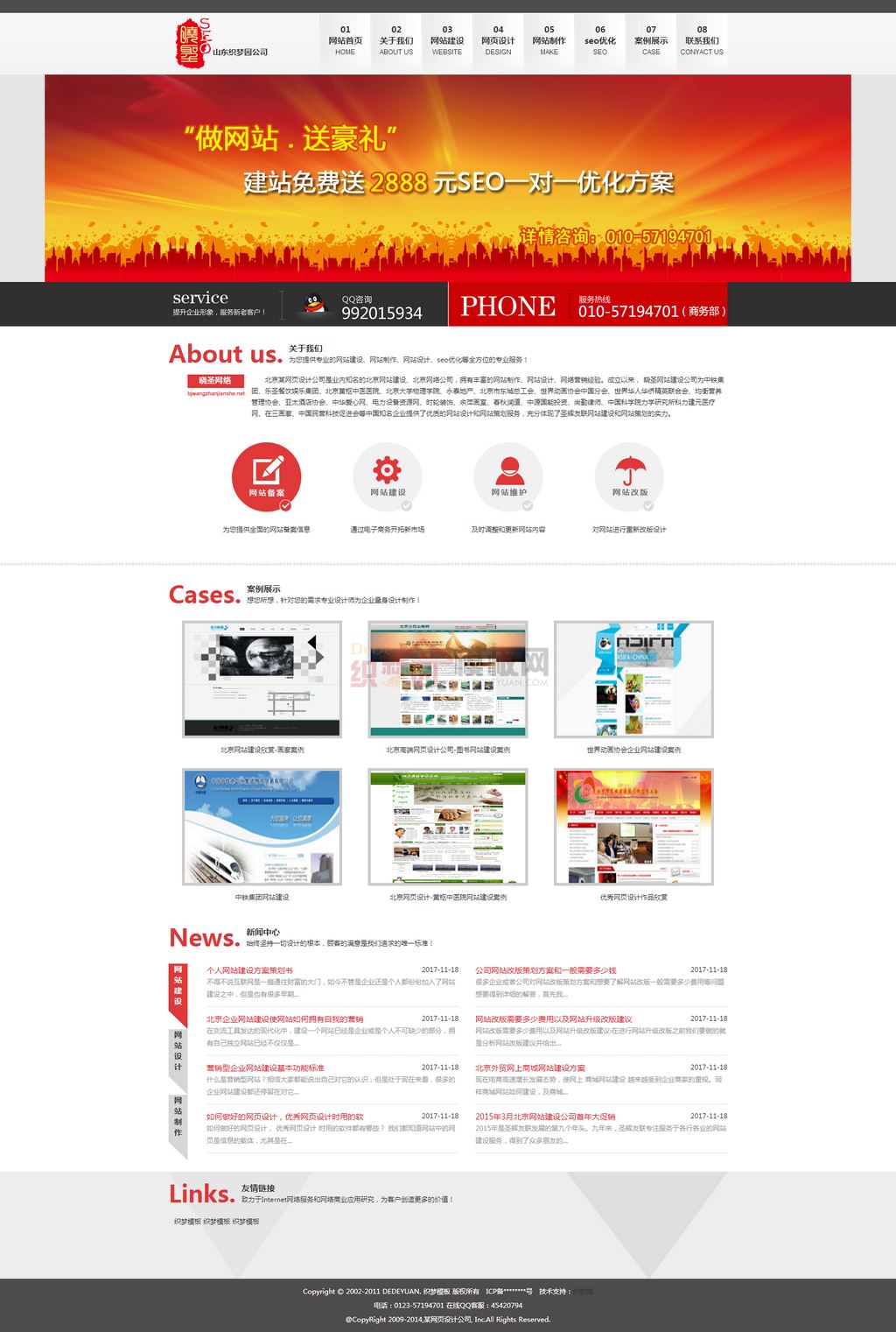 本套模板整站红色和灰色搭配主题,整站宽屏样式设计,界面设计精美大方,导航样式别具一格,内页列表页等相关页面设计比较简洁大方,整站带有测试数据,测试完整,整站备份,适用于网络设计公司、网站建设网站制作类公司企业网站使用。保证源码和演示图片模一样,本地下载后按照安装教程步骤操作,直接还原可用。免费提供给广大朋友下载,本站随问随答和技术性指导。本模板基于DEDECms 5.7 GBK设计,需要UTF-8版本的请自己转换。