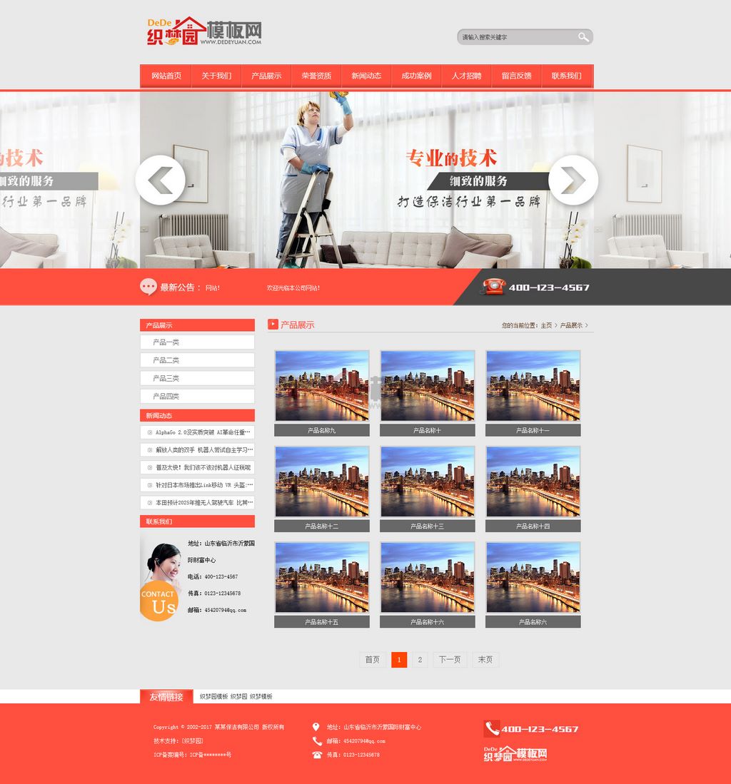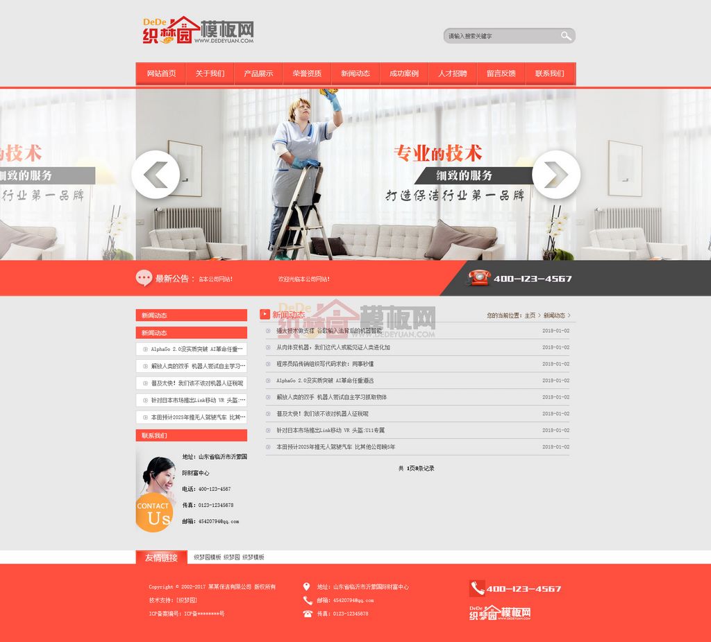 红色保洁清洁家政服务类织梦企业模板带有wap手机端,本套模板整站以红色主题,首页排版布局样式合理大气,内容展示丰富全面,后台数据调用完整无错,内页多套列表页样式设计,整站数据完整打包备份,数据库删除冗余表,适用于家政服务保洁公司等相关清洁类服务公司网站使用。保证源码和演示图片模一样,本地下载后按照安装教程步骤操作,直接还原可用。免费提供给广大朋友下载,本站随问随答和技术性指导。本模板基于DEDECms 5.7 UTF-8设计,需要GBK版本的请自己转换。