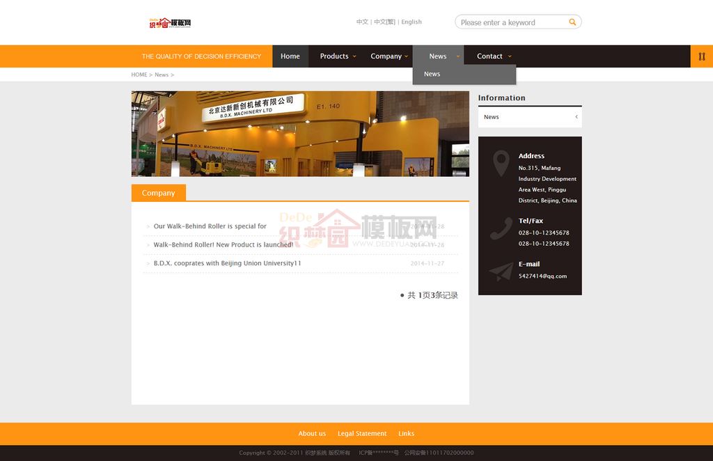 橙色大气机械类英文外贸企业网站dede模板,本套模板全英文展示,首页简洁大方,展示内容丰富,幻灯轮播展示banenr,导航带有下拉菜单功能,黑色和黄色大胆搭配,颜色色彩搭配合理,设置多套模板选择,整体大方,修改了部分错误,适合机械外贸企业、企业英文网站等通用型建站使用;本模板由织梦园团队做了精简和简化,修改了数据库多余的表,修改了模板和样式文件,删除多余的无用链接和图片,织梦园团队力求提供精简代码的高品质模板。保证源码和演示图片一模一样,本地下载后按照安装教程步骤操作,直接还原可用。免费提供给广大朋友下载,本站随问随答和技术性指导。本模板基于DEDECms 5.7 UTF-8设计,需要GBK版本的请自己转换。