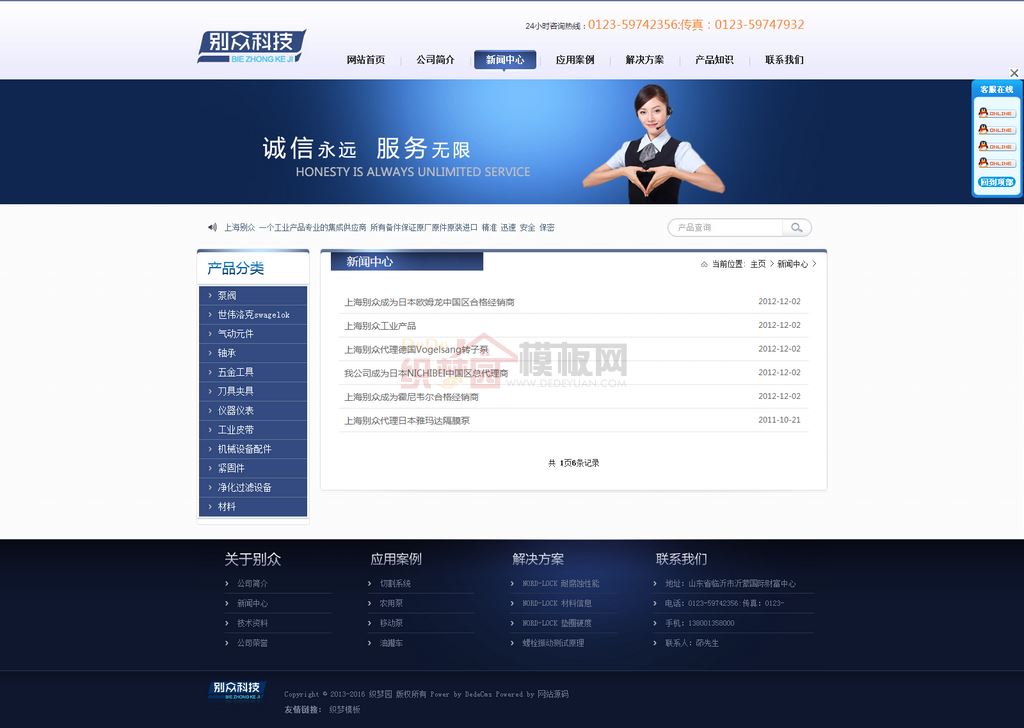 蓝色机械类织梦企业模板,本套模板整站比较简洁大方,色彩上面搭配的比较和谐,头部底部分别采用深颜色的背景设计,banner也是轮播大图全屏播放,产品分类带有二级菜单展示,所有数据后台调用比较完整,测试无错,后台数据比较多,使用的时候删除重新添加即可,本套模板比较适合机械加工制造类相关公司企业使用。保证源码和演示图片一模一样,本地下载后按照安装教程步骤操作,直接还原可用。免费提供给广大朋友下载,本站随问随答和技术性指导。本模板基于DEDECms 5.7 UTF-8设计,需要GBK版本的请自己转换。