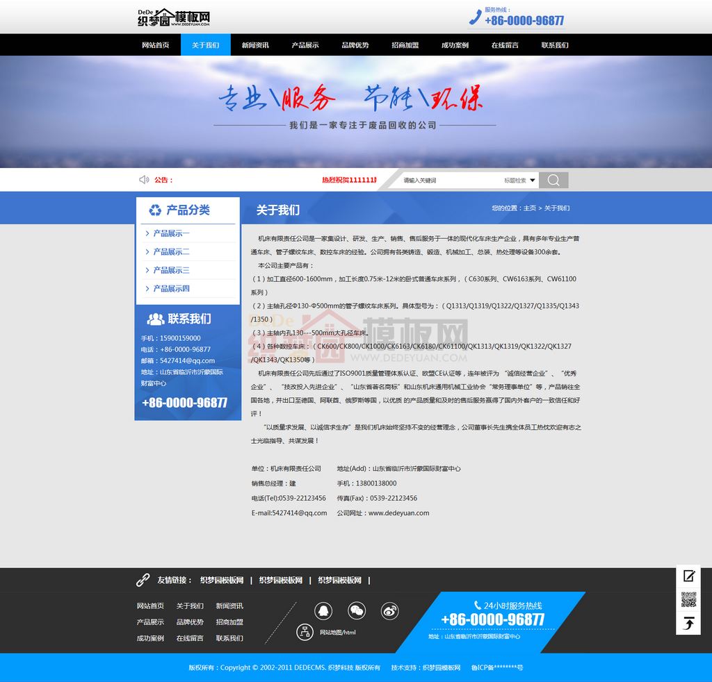 本模板由织梦园模板网仿制,蓝色大气机械类企业织梦模板,首页全屏banner,产品滚动展示,导航下拉菜单,后台可以修改;适用于机械制造企业,机械生产加工公司企业。本源码经过织梦园模板站站长亲测,网站手工DIV+css,代码精简,首页排版整洁大方、布局合理、利于SEO、图文并茂、静态HTML;对部分调用上和外观上做了美化与完善,修复了发现的缺陷,保证织梦模板完整,而且全部已数据调用,织源码和演示图片一模一样,保证织梦模板可以直接使用。由作者提供随问随答和技术性指导。本模板基于DEDECms 5.7 UTF-8设计,需要GBK版本的请自己转换。
