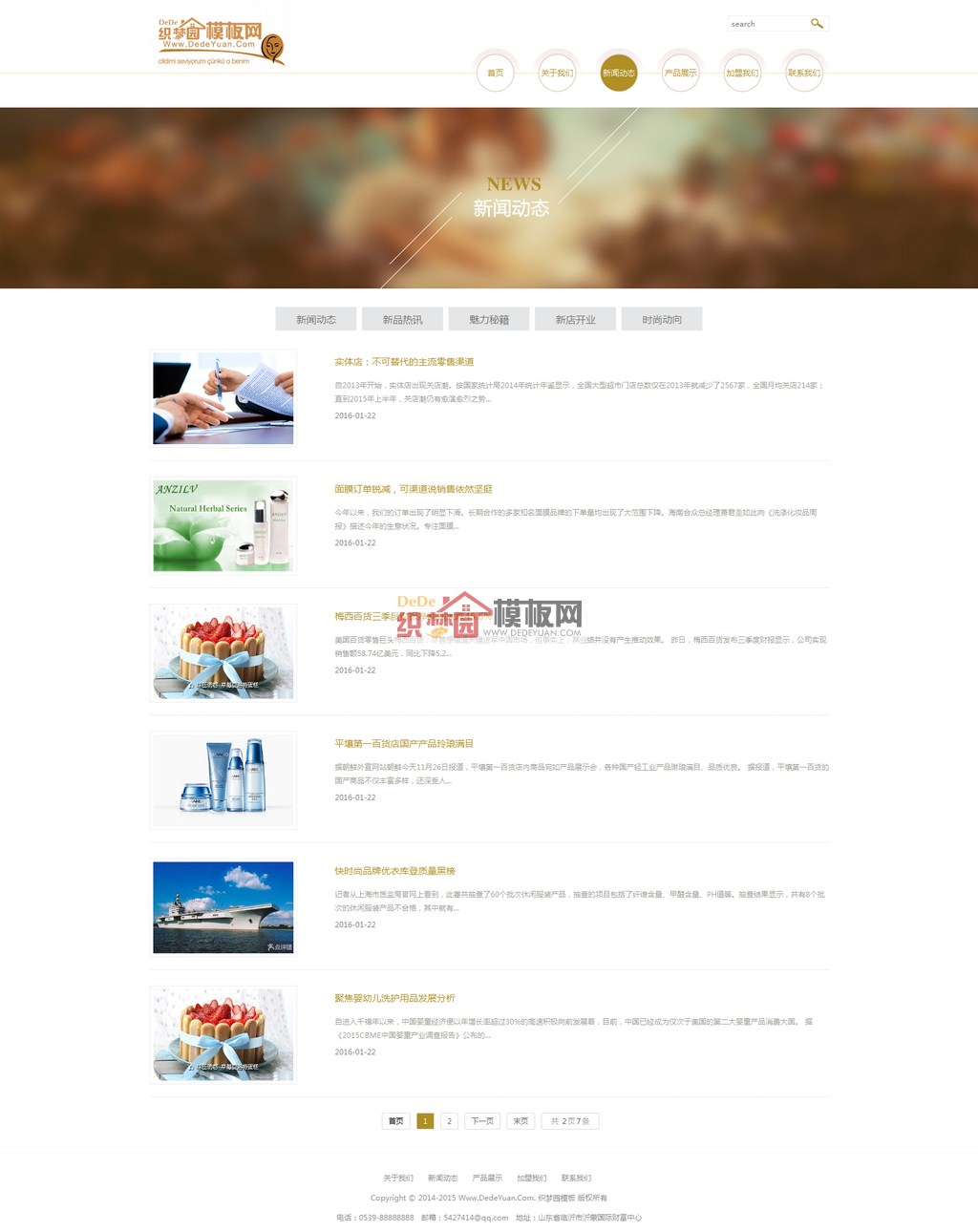 织梦最新内核开发的模板,该模板属于化妆品行业,美容产品销售企业,该模板属于企业通用,各行业均可以使用该模板,本源码经过织梦园模板站站长亲测,网站手工DIV+css,代码精简,首页排版整洁大方、布局合理、利于SEO、图文并茂、静态HTML;对部分调用上和外观上做了美化与完善,修复了发现的缺陷,保证织梦模板完整,而且全部已数据调用,织源码和演示图片一模一样,保证织梦模板可以直接使用。由作者提供免费安装服务,随问随答和技术性指导。本模板基于DEDECms 5.7 UTF-8设计,GBK需要版本的请自己转换。