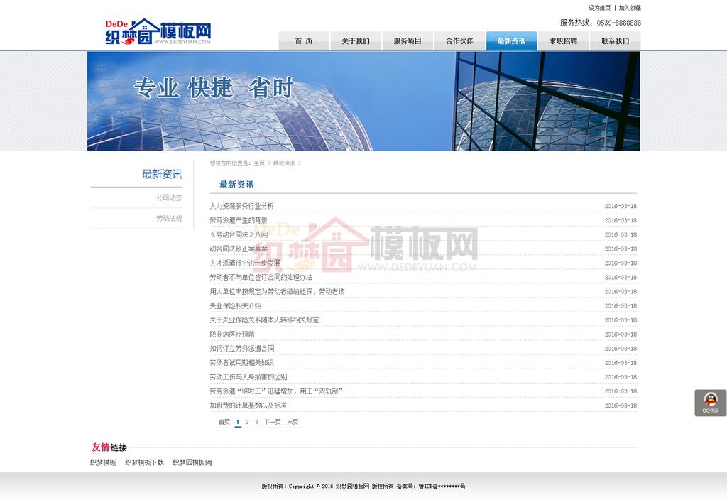 该蓝色织梦企业模板,由织梦园团队精确仿制,修改了原网站不协调的css样式,使整体风格大气时尚,蓝色风格,修改导航下拉菜单样式,整体简洁大方,适合人力资源类公司或者出国劳务公司等使用。本织梦模板整站完整打包,直接安装恢复数据即可使用,功能强大,是难得一见的织梦优秀模板,由作者提供免费安装服务,随问随答和技术性指导。本模板基于DEDECms 5.7 UTF-8设计,需要GBK版本的请自己转换。