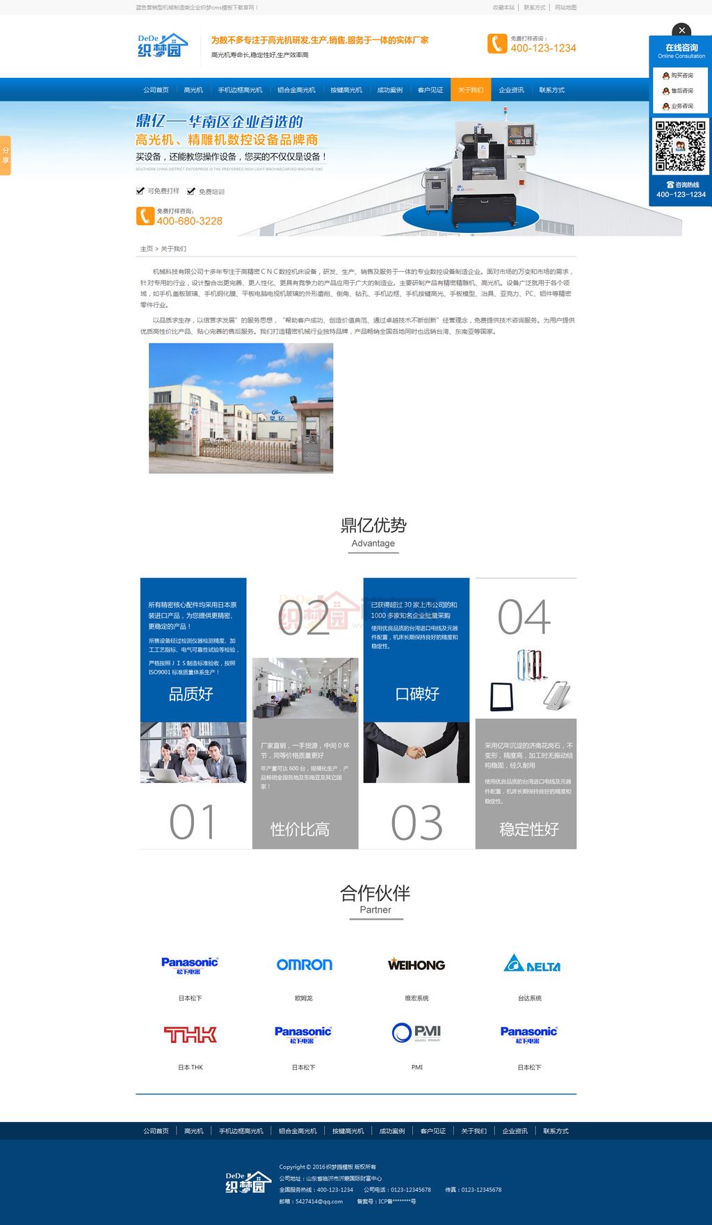 蓝色营销型织梦企业通用模板,该套模板由织梦园亲自仿制,与原网站有99%相似度,产品使用了图集功能,添加了部分变量,建立了多套列表页模板,内容均后台自己添加,整体大气内容展示丰富,页面设计创新时尚;该大气营销型通用模板适合机械类、机械制造加工生产销售类公司使用。本织梦模板整站完整打包,直接安装恢复数据即可使用,功能强大,由作者提供免费安装服务,随问随答和技术性指导。本模板基于DEDECms 5.7 UTF-8设计,需要GBK版本的请自己转换。