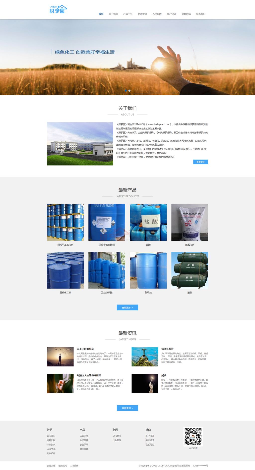 蓝色大气响应式HTML5织梦模板,本套模板首页宽屏大气时尚,蓝色风格简洁大方,整站清新大气,栏目分类明确,页面设计简洁清新,内容展示突出,重点明确,导航栏目带高亮代码展示以及下拉菜单功能,后台带有测试数据,直接安装还原即可使用,响应式自适应HTML5前端代码设计,适合化工类、化学原料类化学品相关行业企业使用;直接下载即可使用,升级到2016年最新织梦系统,本织梦模板整站完整打包,直接安装恢复数据即可使用,功能强大,由作者提供免费安装服务,随问随答和技术性指导。本模板基于DEDECms 5.7 UTF-8设计,需要GBK版本的请自己转换。