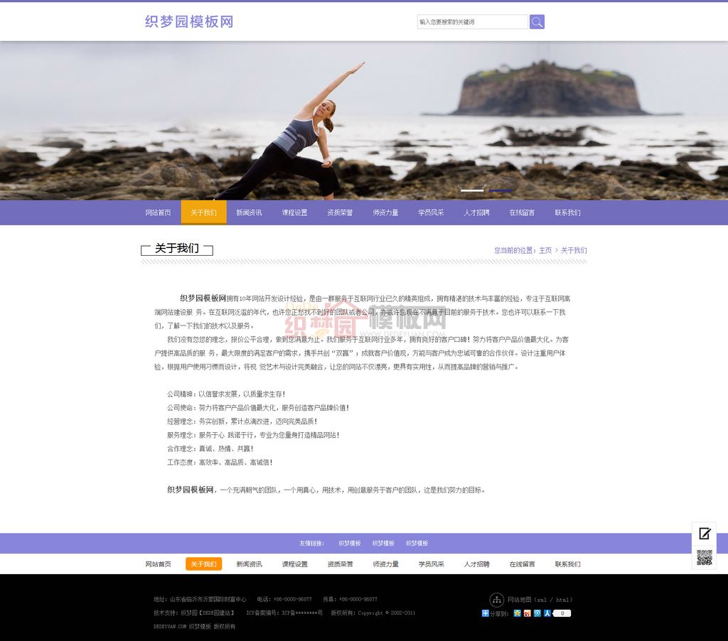 紫色宽屏大气健身瑜伽类织梦企业模板,带手机端,整站比较大气时尚,样式设计精美大方侧边导航,内容测试数据完整,后台无错,多套列表页模板适应不同需求,比较适合瑜伽养生会所、健身机构等相关行业公司企业使用,升级到2017年最新织梦系统,本织梦模板整站完整打包,直接安装恢复数据即可使用,功能强大,由作者提供免费安装服务,随问随答和技术性指导。本模板基于DEDECms 5.7 UTF-8设计,需要GBK版本的请自己转换。