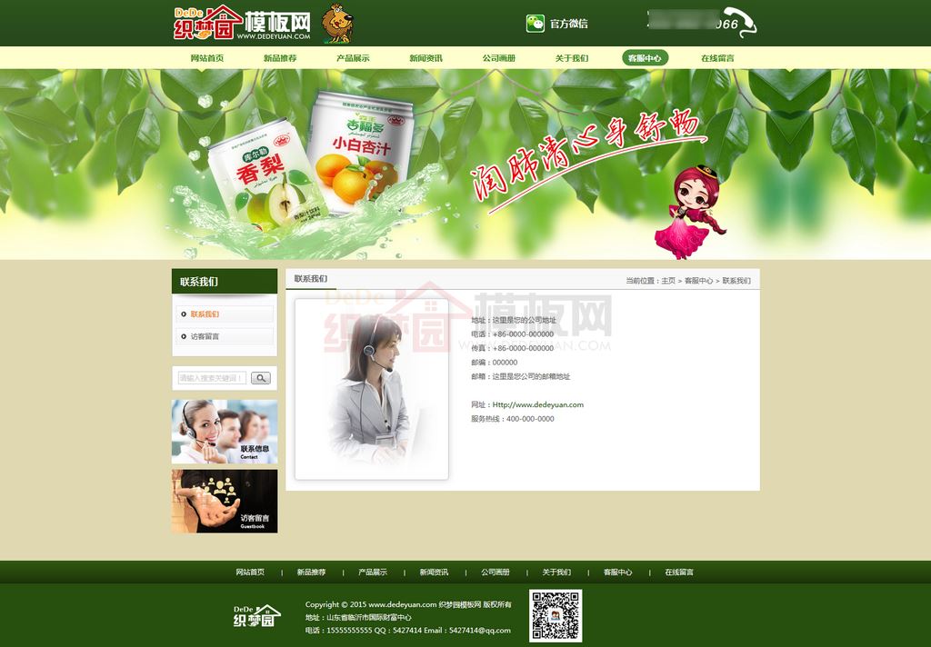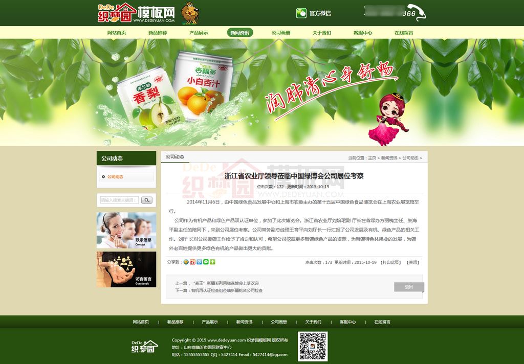 本绿色织梦模板适合于食品类企业,食品加工生产销售公司,和一些食品厂等公司企业使用,完美兼容IE8+、Firefox 、Chrome、360浏览器等主流浏览器。本源码经过织梦园模板站站长亲测,对部分调用上和外观上做了美化与完善,修复了发现的缺陷,保证织梦模板完整,而且全部已数据调用,织源码和演示图片一模一样,保证织梦模板可以直接使用。由作者提供免费安装服务,随问随答和技术性指导。本模板基于DEDECms UTF-8设计,需要GBK版本的请自己转换。