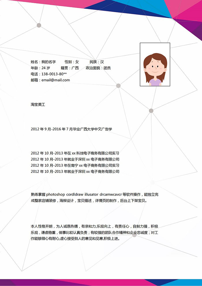 本作品内容为简洁风淘宝美工 设计师求职简历Word简历模板,请使用办公软件Word打开,作品中文字及图均可以修改和编辑,图片更改请在作品中右键图片并更换,文字修改请直接点击文字进行修改,也可以新增和删除作品中的内容,欢迎使用织梦园Word模板。 免责声明:本站所有Word模板资源均来自用户分享和网络收集,仅供学习与参考,请勿用于商业用途,如果损害了您的权利,请联系网站客服处理。