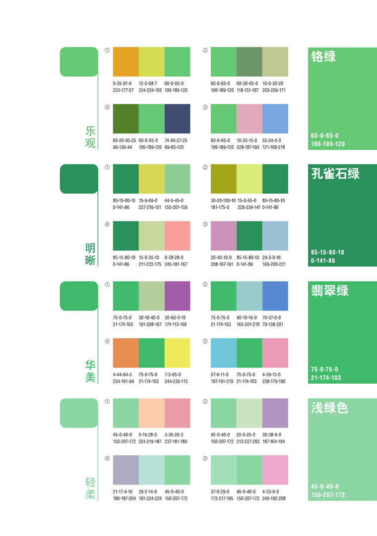 绿色---介于冷暖两中色彩的中间,显得和睦,宁静,健康,安全的感觉。 它和金黄,淡白搭配,可以产生优雅,舒适的气氛。